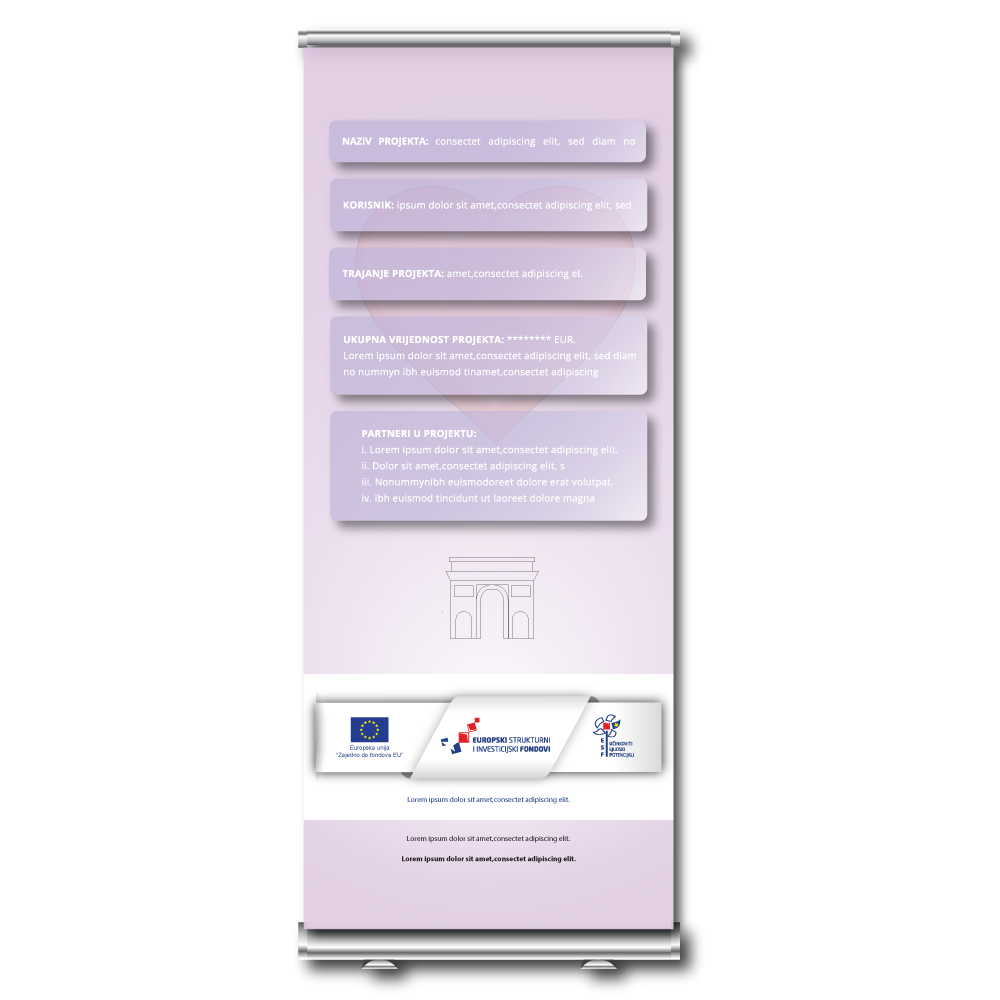 Kako bi se izradila grafička priprema za rollup banner potrebno je dostaviti vaš Prijavni obrazac A naš mail. Nakon primljenog obrasca, pripremamo tekst i logotipove od Europskih fondova po propisanim standardima Europske unije te slijedi izrada grafičkog dizajna rollup bannera. Nakon što odobrite dizajn, grafička priprema se šalje nadležnom tijelu i po potrebi radimo tražene korekcije.